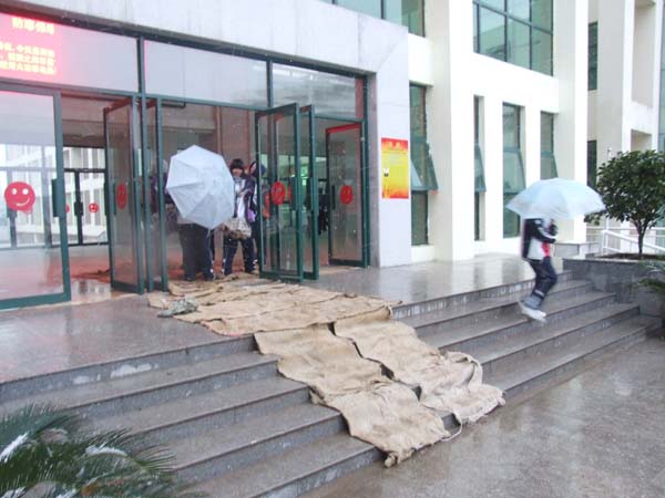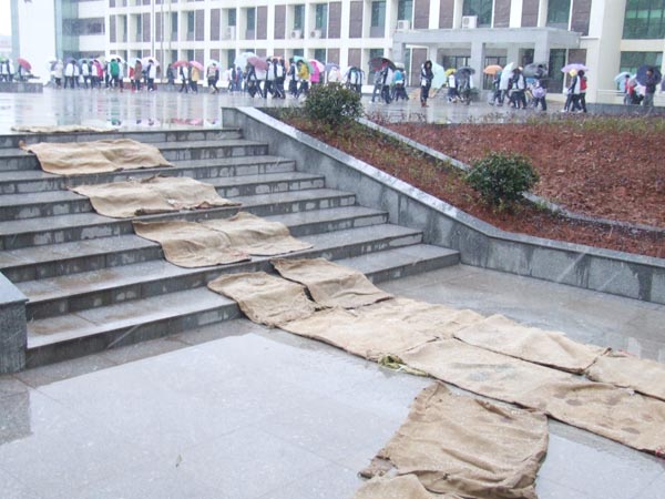 长沙市信息技术学校党委心系学生,迅速行动,于12月15日紧急召开了党委会议,把做好冬季校园安全又一次列入了学校的重要议事日程,部署了相关防滑防冻安全措施,从宁乡紧急调运了麻袋400多个,购买工业盐200多公斤。学校党委书记左玉辉、校长郭正良、纪委书记李深山等校领导带领总务科的同志将麻袋铺在学生出行的主要楼梯台阶,将工业盐撒在影响学生出行的主要路段,确保学生出行安全。