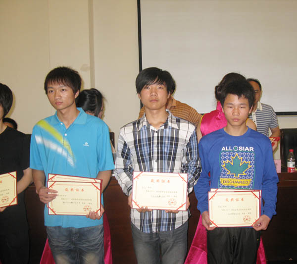 我校企业网搭建及应用一等奖获得者(右一、二分别为李林、童飞)在领奖中
