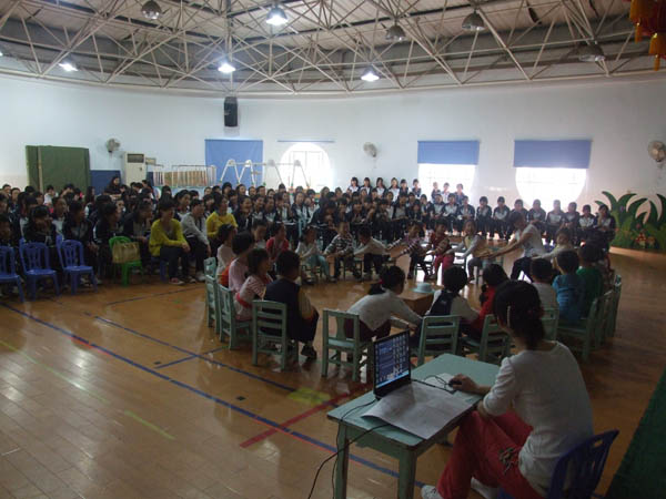 青年党校学员们认真听幼儿园大班音乐欣赏课