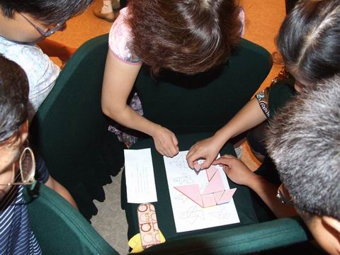 游戏《盲人建屋》学员正在分享团队合作的胜利成果