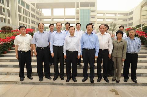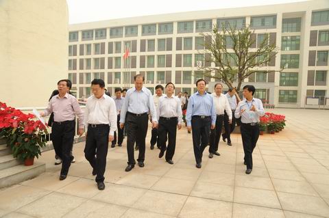 贯彻落实《教育规划纲要》检查组及省市领导与校领导在学校中心广场前合影