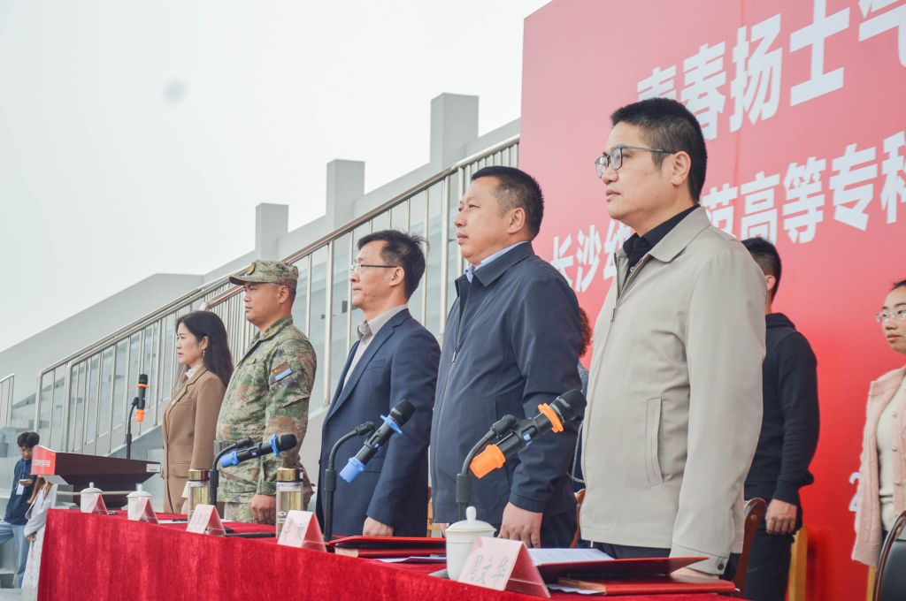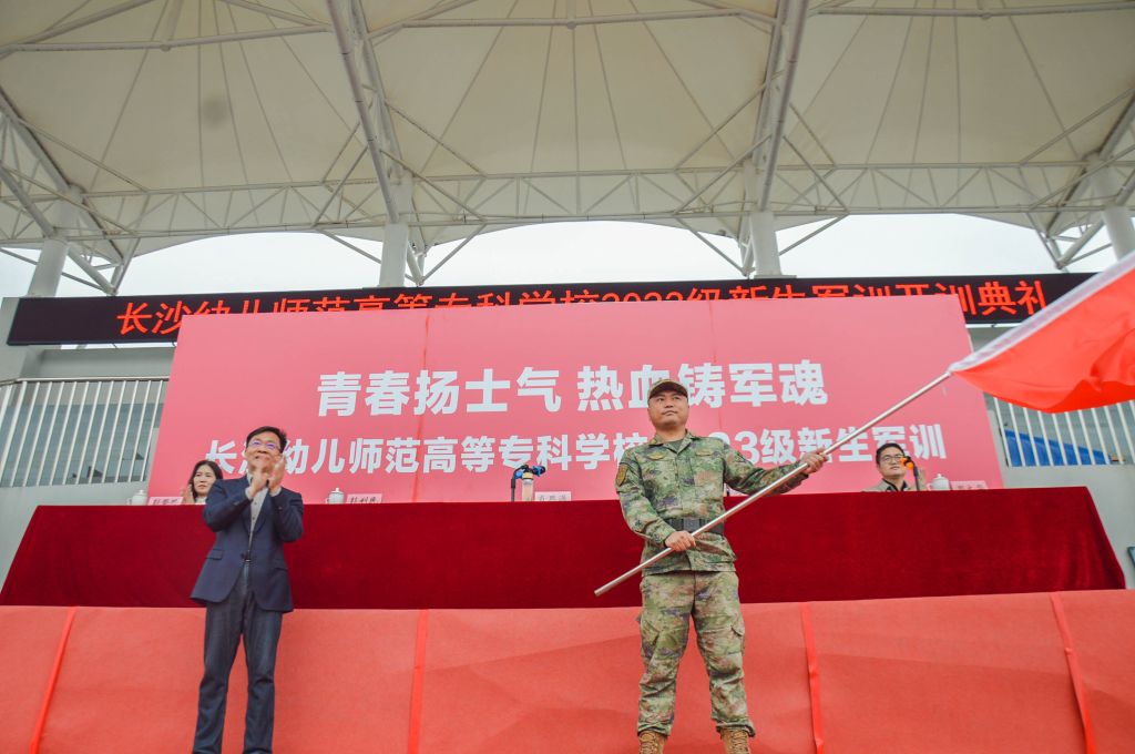 伴随着威严的音乐声,举行了隆重的授旗仪式,学校党委书记肖思源为军训团授旗,军训团旗迎风飘扬,长沙幼师高专军训团以旗明志!