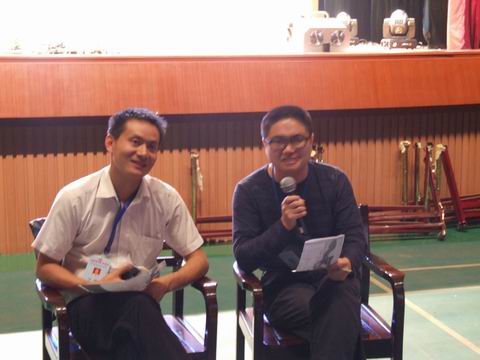 学校邀请校友蔡颂(中)、宋美纯(左)和本校老师担任节目主持