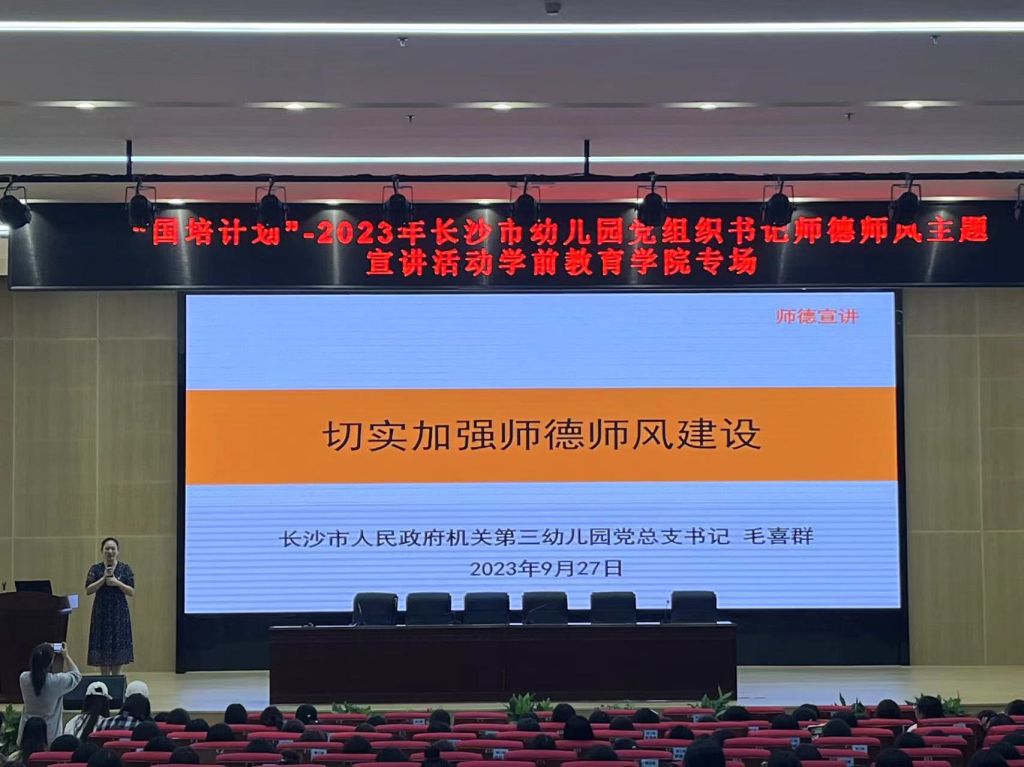 同时,长沙市岳麓区广云幼儿园党支部书记兼园长陈静、长沙市人民政府机关荷花幼儿园党总支书记丁莉、长沙市岳麓幼教集团第五幼儿园园长常永龄、开福区喜哆哆幼儿园党支部书记兼园长康晓分别赴长沙市岳麓区广云幼儿园、宁乡市玉潭街道兆基璟宸幼儿园、长沙市岳麓幼儿教育集团第五幼儿园、开福区哆哆宝贝幼儿园进行师德师风宣讲。他们用自身参与工作以来的成长历程,阐述着师者的爱心、诚心、责任心、感恩心,述说着怎样做一名身正、气正,有所成就的新时代教师。各园教师在宣誓中重温初心,在专题学习中强化担当,在签订师德承诺书中坚定使命。
