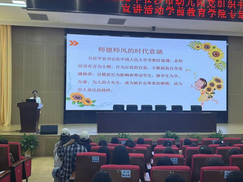长沙幼师高专学前教育学院22级学前教育专业、早期教育专业、婴幼儿托育服务与管理专业及体育教育专业的同学们通过专题《牢记殷切嘱托·争做“四有”教师》《清“莲”东湖边,守望道德星空的那群人》《切实加强师德师风建设》《“深耕”十年做幼儿自主发展的引路人》,聆听着爱岗敬业、甘为人梯、乐于奉献的感人事迹,深受精神的感染与鼓舞。