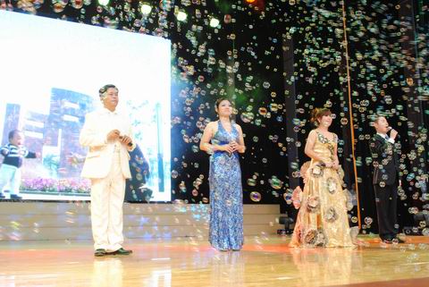庆典大会后文艺汇演精彩上演,图为校友蔡颂(中)、宋美纯(左)与我校老师李希尔同台主持节目