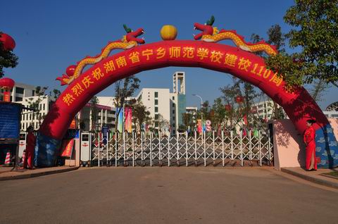 阳光明媚,秋风送爽,彩旗飘扬,彩球高悬。欢乐的锣鼓阵阵敲响,迎宾的乐曲连连奏起。“热烈庆祝湖南省宁乡师范学校建校110周年“、“湖南省宁乡师范学校热烈欢迎各位校友嘉宾”、“承百年薪火德术并重激昂奋进改革创新示范校、铸十年风云做学合一青春演绎朴实文明新华章”、“积代传承成就宁师精神,与时俱进彰显长信风范”、“文化立校、人才强校、品牌兴校、创新活校”等巨幅标语异常耀眼,中心广场前阶“110周年”几个鲜花字样光彩照人,汇成一个欢乐的海洋,激情的世界,湖南省宁乡师范学校校园处处都洋溢着喜庆、吉祥的节日氛围。