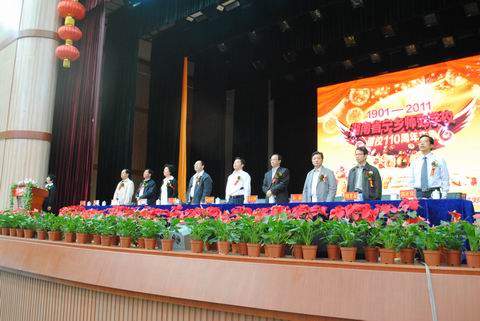 庆典大会在雄壮的国歌声中拉开帷幕,图为大会主席台。(从左至右依次为湖南省宁乡师范学校党委书记左玉辉、湖南省教科院副院长李三福、长沙市人民政府副秘书长刘秋成、长沙市政协委员会副主席钟新莲、湖南省教育厅副厅长王键、长沙市人民政府副市长何寄华、湖南省教科院院长姜正国、长沙市商贸旅游职院党委书记、原长沙市教育局局长彭新、湖南省教育厅职成处副处长周芳友、湖南省宁乡师范学校校长郭正良)