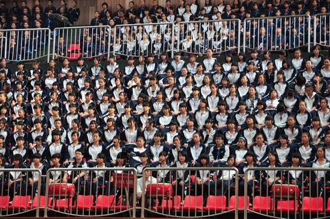 全体师生参加庆典大会,图为看台区学生安然就坐