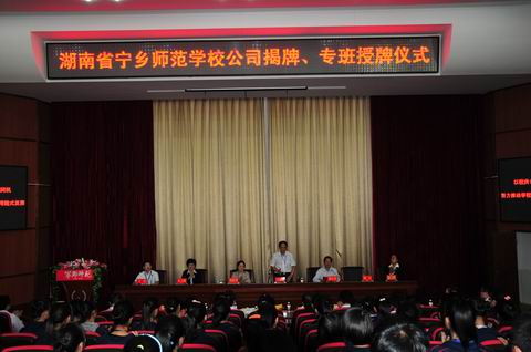 湖南省宁乡师范学校公司揭牌、专班授牌仪式在汇智厅举行,图为主席台,市教育局副局长王建林(左四)到会指导。