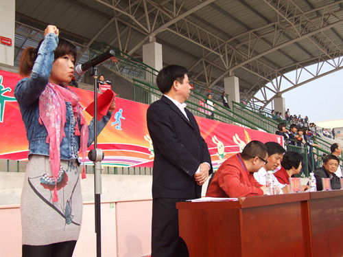 接下来,运动员代表1109班刘思敏同学,裁判员代表聂晓老师分别宣誓。随后,左玉辉书记宣布运动会开幕🎛。