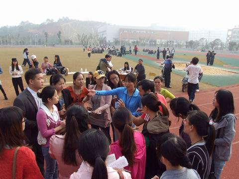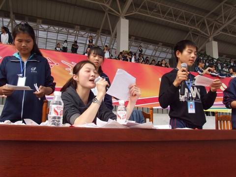 赛场外啦拉队员则以他们响彻云霄的呐喊声为健儿们助威;细致认真的后勤工作者坚守岗位,奔波于赛场,为运动员们提供周到细微的服务;而穿梭在赛场上的播音员则密切关注赛程进展,将最新的赛场资讯第一时间呈现出来;裁判员公正执法时,不时时刻送上温和的鼓励;班主任如同领队一般,多处关注本班的比赛状况,又随时提醒同学要注意安全,赛出友谊、赛出水平……赛场上到处是忙碌的身影,友谊的交流,各幕后人员筑成赛场上另一道亮丽的风景线。