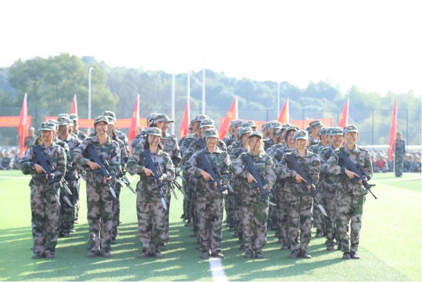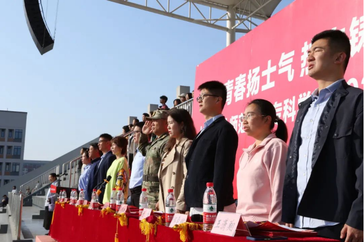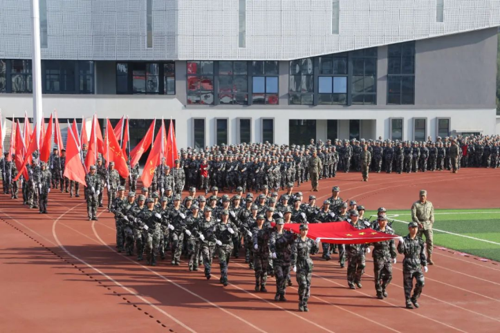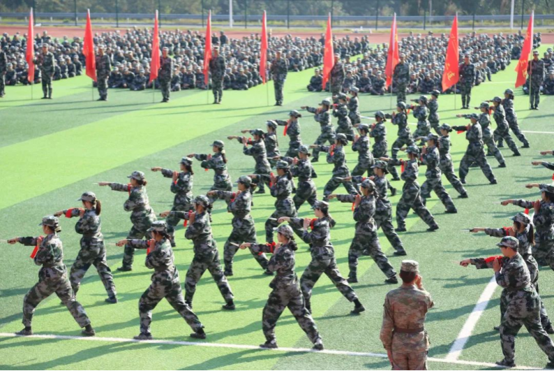大会伊始,国旗护卫队伴着庄严的国歌,踏着稳健的步伐护送国旗入场,嘹亮的国歌响起,全体肃立,晨光照耀下国旗徐徐上升。随后排列于环形红色跑道上的26支军训连队,跟随激昂的《运动员进行曲》踏步前进。他们迈着整齐的步伐,喊着嘹亮的口号步入主席台前方,接受检阅。紧接着是匕首连风采展示,匕首出鞘,臂间红绳随其舞动,一招一式,潇洒干练,尽显女子英气;战术连紧随其后,沙场亮利剑,一令一动,英姿飒爽。