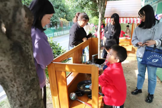 随后,学员们共探乐园,观摩童心幼儿园户外自主游戏。童心幼儿园巧妙利用每一寸土地、合理规划每一块空间,将户外场地变为孩子们的“游乐园”,设置了建构、沙石、骑行、表演、美食与养殖等场地,场地间的融合、共用与分隔浑然天成,是孩子们“精神自由、游戏自主、心灵愉悦”的乐园,满足了孩子各种游戏活动的需要。孩子们肆意奔跑、快乐嬉戏、勇敢挑战,展现着孩子应有的模样,诠释着游戏应有的魅力,学员们纷纷感叹:农村幼儿园自主游戏竟能如此精彩!