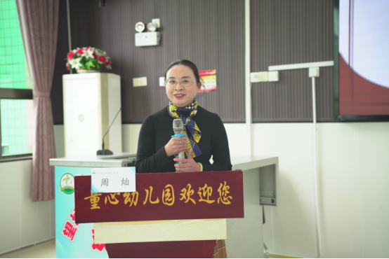 在参观结束后的专题分享中,周灿在《笃行同心谋发展,奋楫共进筑品质》专题分享中以“共建”为着力点,探讨资金统筹与环境整合的互通协调,讲述人心凝聚与专业发展的递进生成,阐明协同育人与多元合作的生态融合之法;以“同行”为突破口,分享童心幼儿园教师团队的建设之策,期盼农村幼儿园“同心亦同行”,共同追寻更有品质的乡村学前教育!