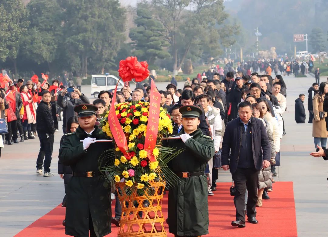 签约挂牌仪式结束以后,全体成员在毛主席铜像前敬献花篮。湘中幼儿师范高等专科学校马克思主义学院党支部书记、院长陈新明,娄底幼儿师范高等专科学校马克思主义学院院长潘伟峰整理花篮绶带,益阳师范高等专科学校马克思主义学院院长伍晔领读重温入党誓词,随后开展大思政课现场教学。