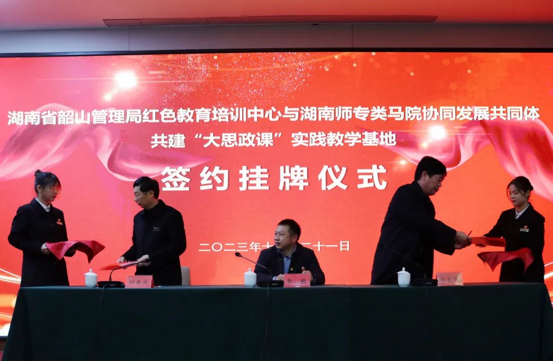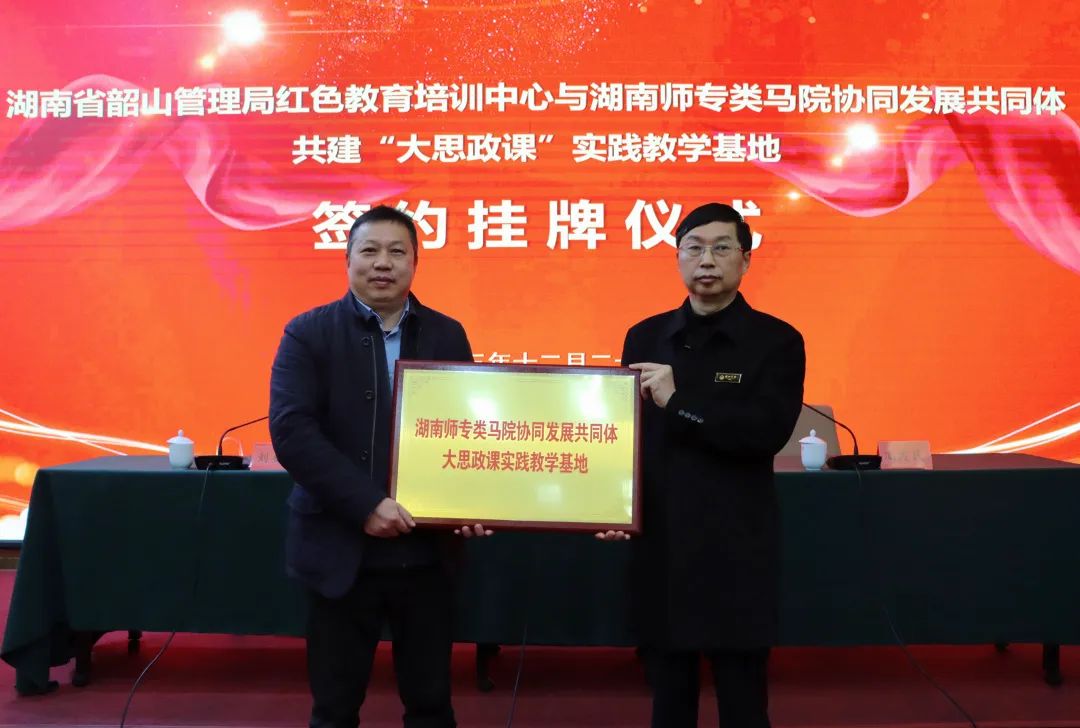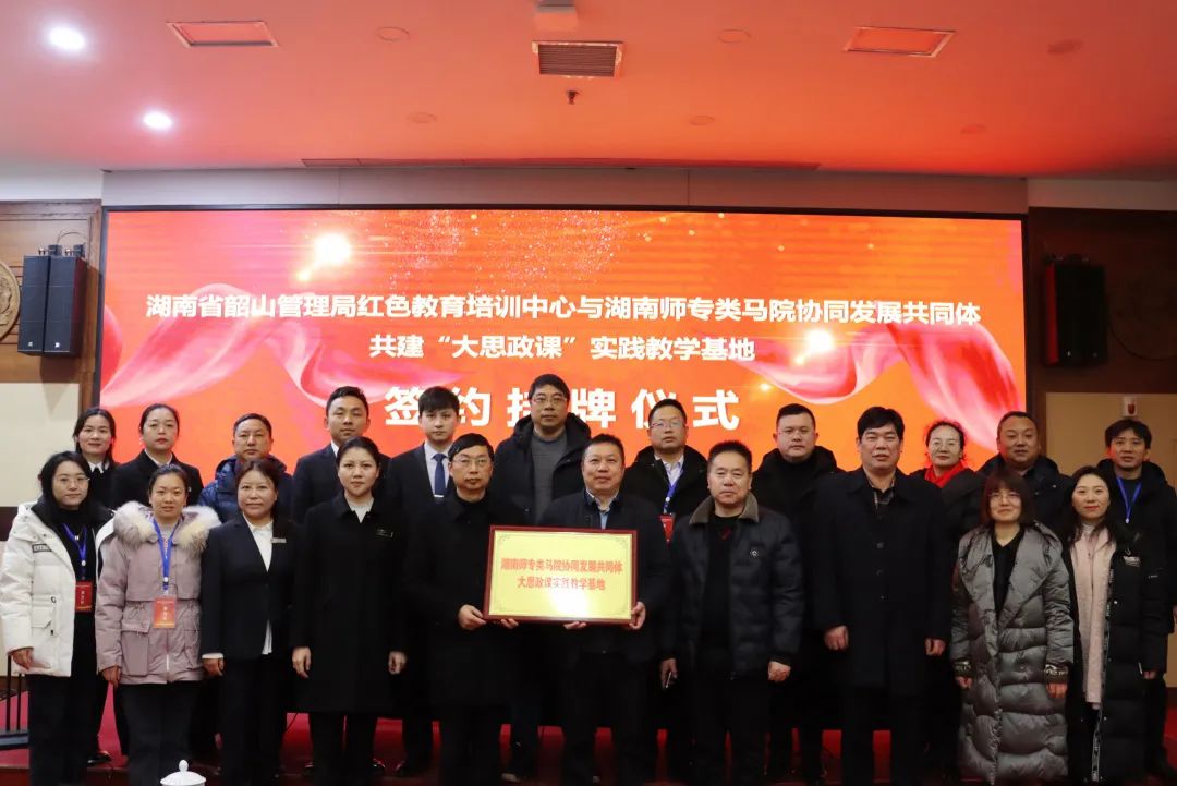 湖南师专类马院协同发展共同体成员汇聚在伟大人民领袖毛主席故乡——韶山,共同见证“大思政课”实践教学基地的签约挂牌。