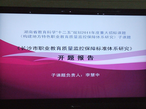 4月25日上午9:00,我校申报的湖南省教育科学“十二五”规划2011年度重大招标课题《构建地方特色职业教育质量监控保障体系研究》子课题《长沙市中等职业教育质量监控保障标准体系研究》开题论证会在学校广益厅如期举行。