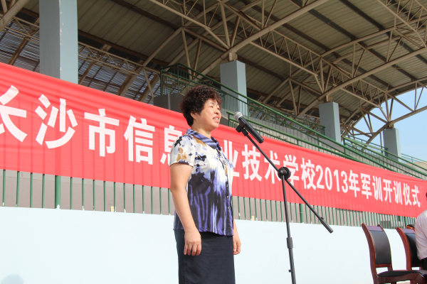 郭正良校长首先代表学校向来自国防科大的军训教官们致以诚挚的感谢和崇高的敬意,并对2013级新生提出了几点要求和希望,要学习军人严明的纪律、过硬的作风;要学习军人坚强的意志和特别能吃苦、特别能战斗的精神;要学习军人团结协作的团队精神;要积极参训、顽强拼搏,训练时不偷懒、不叫苦、不掉队。将军训铁一般的精神带回学校,并尽快融入班级开展一段新的生活。随后,新生代表1303班谭晶、教官代表国防科大人文学院参谋长刘坤分别作了热情洋溢的发言。最后,党委书记左玉辉宣布:长沙市信息技术学校2013级新生军训正式开始!