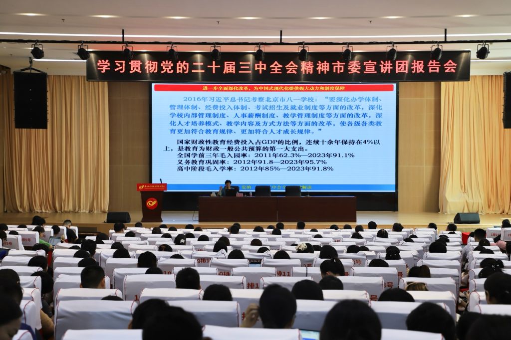 根据市委统一安排,9月3日,市委宣讲团成员市委党校(市行政学院)政治和法律教研部主任教授张凯兰在图书馆报告厅为我校开展党的二十届三中全会精神宣讲。在校校领导及全体教职工近400人参加,党委委员,副校长周文华主持。