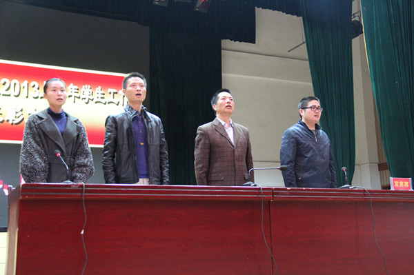 总结表彰大会在庄严的国歌声中拉开帷幕。会上,首先由周文华助理做了2013年上学年学生工作总结报告,他主要从义务劳动、三自社会实践活动、政治活动、财产管理、欢迎回家等方面进行了详细的总结,并高度赞扬了在上学年各种校园文化活动中通过不懈努力为班级、学校争得荣誉的同学。