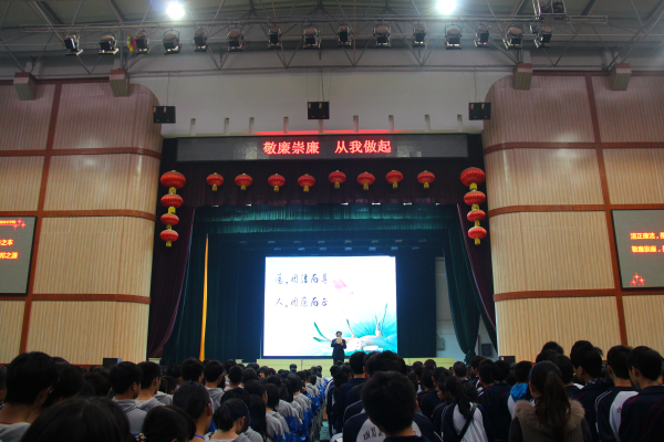 李书记在发言中指出,青少年学生从小就应该知廉、懂廉、敬廉、崇廉,树立清正廉洁的品格,确保我们的事业后继有人、长治久安。特别是党的十八大以习近平总书记的党中央不断加大反腐力度,在反腐工作中,打苍蝇(即基层人员)和打老虎(即高级官员)同等重要。要坚持老虎、苍蝇一起打,既坚决查处领导干部违纪违法案件,又切实解决发生在群众身边的不正之风和腐败问题。由古文《爱莲说》的讲解,李书记给同学们引出了3点建议:1、树立正确的人生观、世界观和价值观;2、从小就做堂堂正正的人、清清白白的人;3、从敬重有操守、重清廉的人开始;从宗教有正气重气节的人开始,从正确对待财物、对待朋友开始,自觉抵制不良社会风气的侵蚀。
