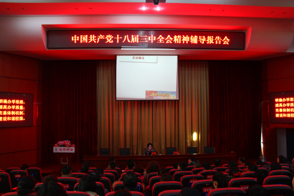 余敏老师回顾了自十一届三中全会以来我党召开的历届三中全会,全面介绍了十八届三中全会的基本情况,重点传达了十八届三中全会公报和习近平总书记重要讲话主要精神,通报了《中共中央关于全面深化改革若干重大问题的决定》的重要意义、指导思想和重大战略部署,特别是关于深化教育领域综合改革的政策举措,并就做好三中全会精神的学习宣传贯彻工作作了动员部署。报告内涵丰富,思想深刻,重点突出,既有实践总结,又有理论思考,深入浅出,通俗易懂,在与会听众中引起热烈反响。老师们纷纷表示,报告紧密联系我国全面深化改革面临的新形势、新任务,对党的十八届三中全会精神和《决定》进行了全面系统深入的解读,使大家进一步加深了对全会精神实质的理解和把握。