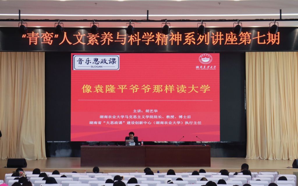 我有着一个梦,埋在泥土中深信它不同。光给了它希望,雨给了它滋养,它陪种子成长……”3月25日下午,一首由袁隆平爷爷作词的歌曲《我有一个梦》正在我校图书馆报告厅中悠然响起,湖南农业大学马院院长教授胡艺华正给我校400余名师生开展“像袁隆平爷爷那样读大学”的主题讲座,开启一场跨越时空的精神对话。