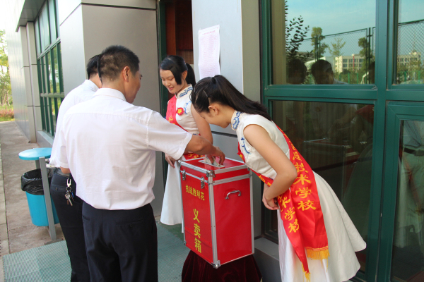 早上7:30,陆续进入会场的师生就发现今年的开学与往年不同。学校汇美馆门前,4位礼仪队的同学手托礼盘义卖别致的“胜利花”。过往师生纷纷驻足,向“义卖箱”投入自己一份爱心,场面庄重而温情。