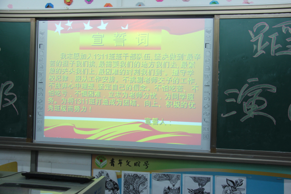 “我志愿加入1311班班干部队伍,坚决做到最辛苦的担子我们挑,最需要我们的地方我们去,最紧急的关头我们上,最困难的时刻我们到……”