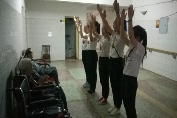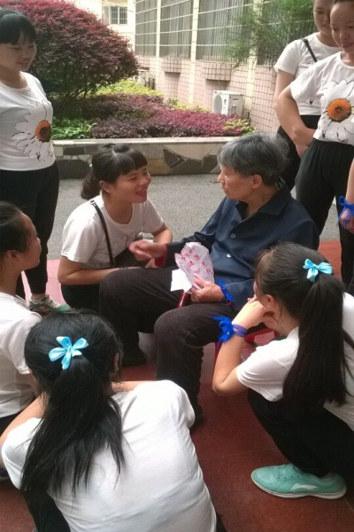 在班主任邓玉湘老师的带领下,同学们亲手替老人系上代表爱心的蓝丝带,送上真诚的祝福。同学们还张罗着为老人们打扫房间、院子,帮老人剪指甲,陪老人聊天解闷,自发给老人们表演节目、讲述校园趣事,动听的歌声、幽默风趣的笑话引来老人们阵阵舒心的笑声。