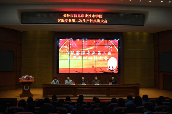 3月16日,长沙市信息技术学校2014届客户信息服务专业学生迎来了第二次生产性实训动员大会。学校纪委书记李深山、招生就业科科长何重兴、教务科科长张学锋出席会议并讲话,本次生产性实训合作伙伴深圳天云祥网络科技有限公司杨怀远总经理出席会议,2014届客户信息服务专业全体学生、各班主任及任课老师参加会议。