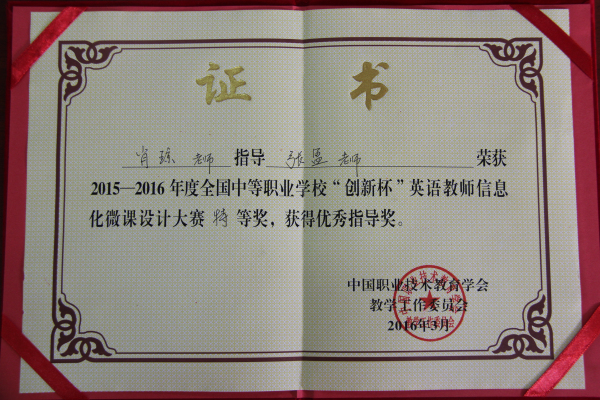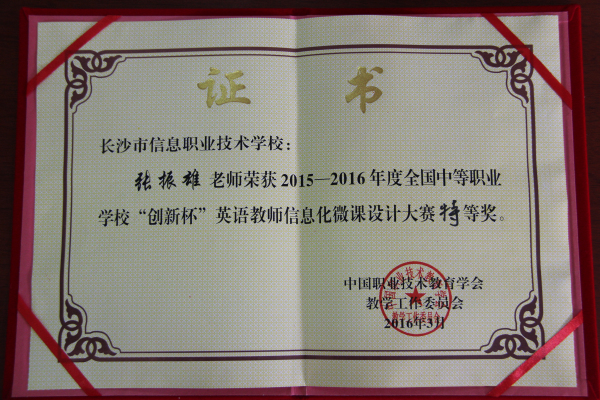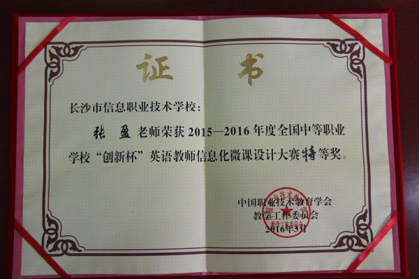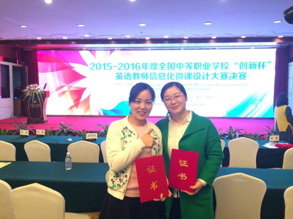 近日,2015-2016年度全国中等职业学校 “创新杯”英语教师信息化微课设计大赛决赛在宁波市落下帷幕。来自全国各省市共计99位参赛选手同台竞技,经过激烈角逐,湖南省宁乡师范学校(长沙市信息职业技术学校)张盈老师沉着应对,发挥出色,最终以优异的表现赢得了评委们的肯定,荣膺特等奖。学校张振雄老师为其制作的出色课件被评委认定为共同作者与张盈老师一同评为“特等奖”,肖琼老师作为张盈老师的指导老师荣获“优秀指导奖”。