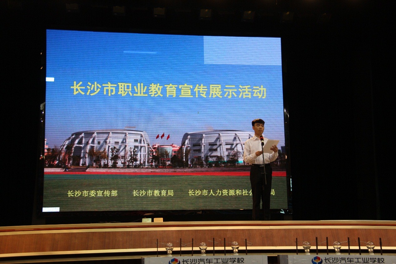 市教育局党委书记、局长卢鸿鸣致辞。市政府秘书长谭勇宣布“2016年长沙职业教育宣传活动周”正式启动,以“弘扬工匠精神,培养技能人才“为主题的第二届长沙职业教育宣传活动周全面开始。我校卢扬驰同学代表学生进行发言。活动重点宣传展示了全市优秀职业院校、优秀毕业生和技能名师,彰显了近几年长沙职业教育持续创新发展的特色与亮点。在汇美馆场内,来自各职业院校的学生们晒出十八般武艺,灯泡上切钢丝、食雕制作、茶艺表演、造型设计、模特走秀……这些各具特色的主题展演,让前来参加首届“职业教育活动周”启动仪式的学生和社区居民,表示自己开始真正认识职业教育。