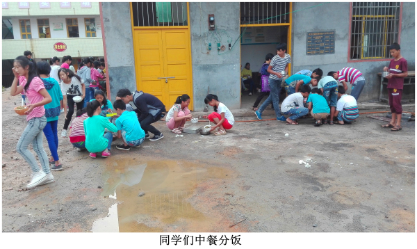 来到法新中学,那是去年9月初的一个傍晚,刚下过小雨,扑面而来的是与大城市带着水泥燥热截然不同的夹杂着泥土芬芳的清凉气息。一进校门,何艺鸿老师就被眼前的一幕震惊了——刚好是学校寄宿生开晚饭的时间,只见孩子们一堆堆地散布在教学楼的走廊上或者泥泞的空地上分饭,然后便是这里一堆,那儿一群地快速吃饭,没有餐桌,没有凳子,有的只是嘈杂和混乱……“那一刻,首先是震惊,然后便是心酸,几乎都有想流泪的感觉,孩子们的学习、生活条件真是太艰苦了。从那时起,没有了刚到一个新环境的好奇,心底想的都是该怎样去尽自己的力量帮助他们……”