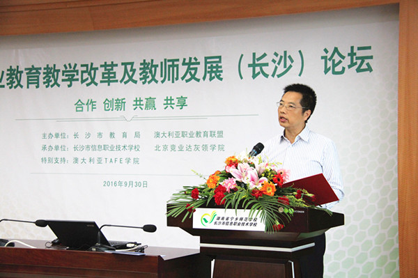 由长沙市教育局、长沙中华职业教育社、澳大利亚职业教育联盟主办,我校和北京灰领学院承办的“中澳职业教育教学改革及教师发展(长沙)论坛”9月30日在我校宁觉厅举行。湖南省教育厅职成处副处长周韶峰、长沙市教育局副局长杨庆江、长沙中华职业教育社秘书长兼办公室主任马芜茗、长沙市教育局职成处副处长范霖、长沙市信息职业技术学校校长郭正良等出席论坛活动。本次论坛活动由马芜茗主任主持。