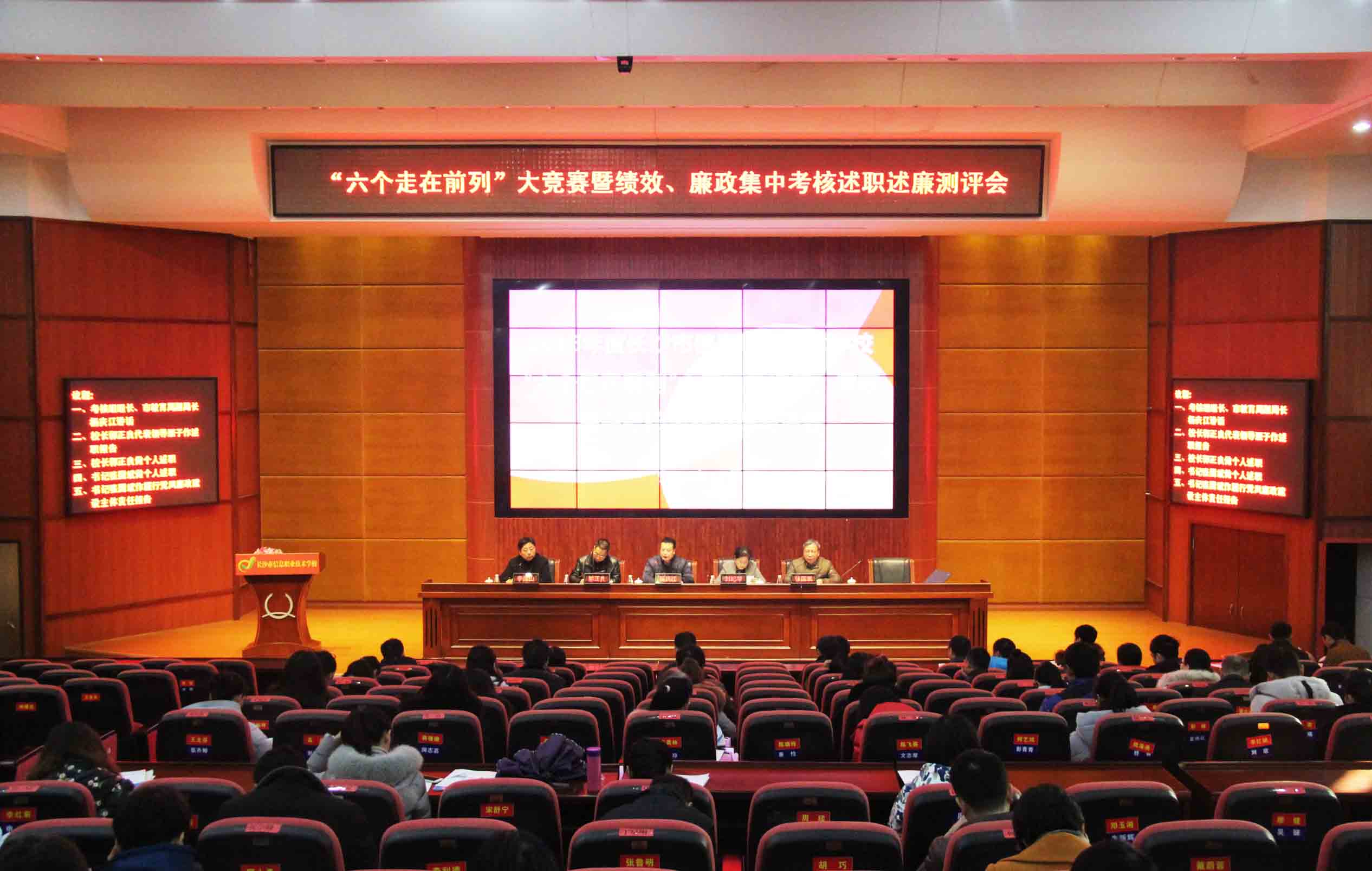 都说时光如梭,转眼2016年的工作又接近尾声,12月27日上午,学校迎来了以长沙市教育局副局长杨庆江为组长的绩效考核工作小组一行8人,召开2016年度“六个走在前列”大竞赛暨绩效、廉政集中考核述职述廉测评会。本次考评工作将通过个人述职、查看资料、民主测评、个别谈话、实地考察等形式进行。我校领导班子全体成员及六十多位教职工代表参加了此次会议。会议由党委书记张国斌主持。