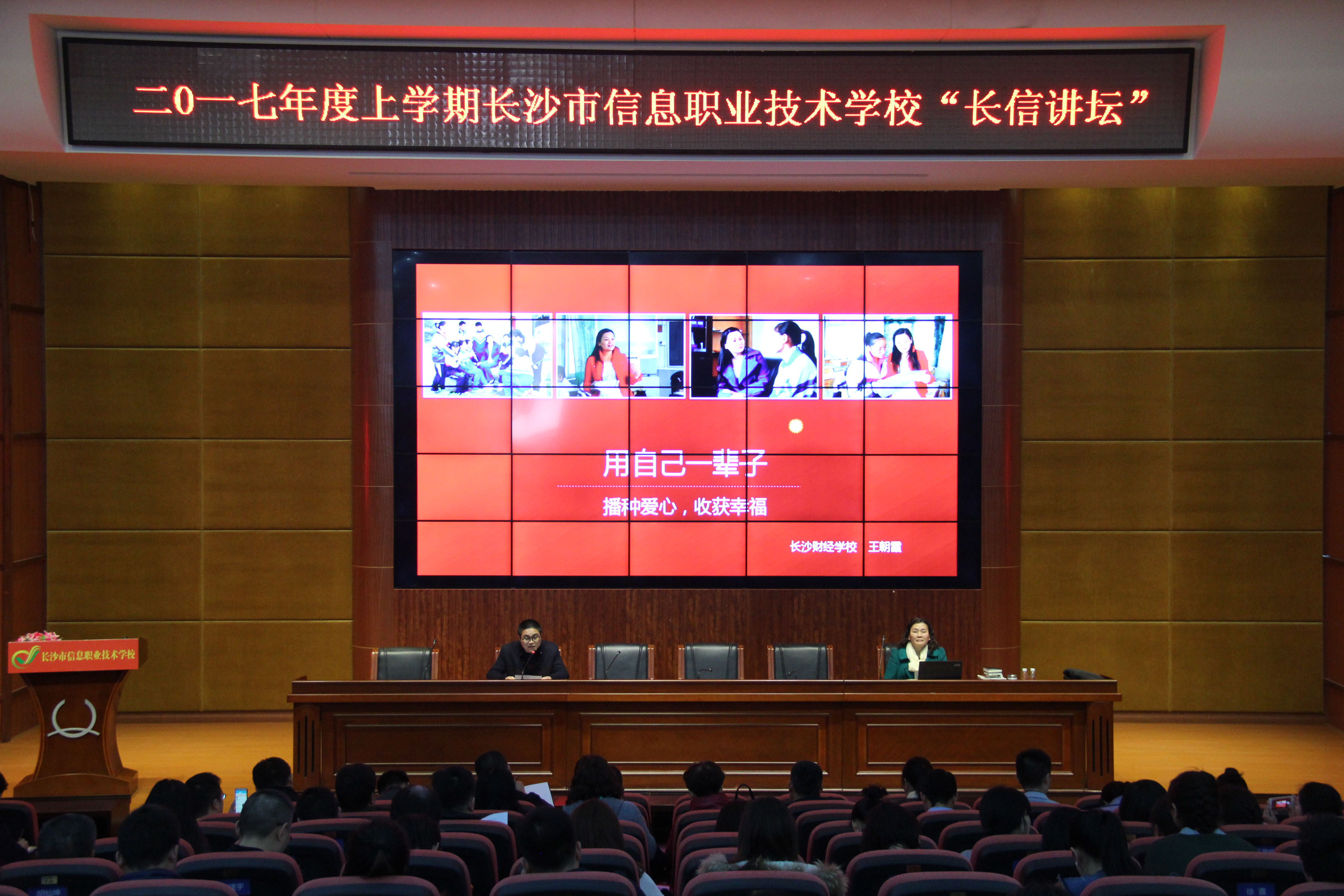 3月27日下午,学校在汇智厅举办“长信讲坛”,国家级骨干教师,湖南省首批教授级高级教师王朝霞老师应邀来校做《用自己一辈子,播种爱心,收获幸福》专题讲座,会议由副校长周文华主持。