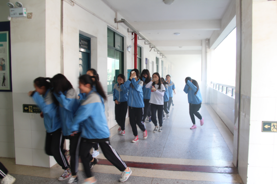 一声急促的警报声将全校带入了模拟火灾现场,只听见广播里播报紧急通知:现在开始紧急疏散,请全体学生严格按照疏散路线有序、快速撤离现场,下楼梯不要推挤,注意安全。只见各班学生在任课老师的有效组织下,用手捂住自己的口鼻,避免“有害气体”的吸入,快速而有秩序地撤离到空旷的安全地带。排队、清点人数、报告到位情况,规定动作规范、娴熟。