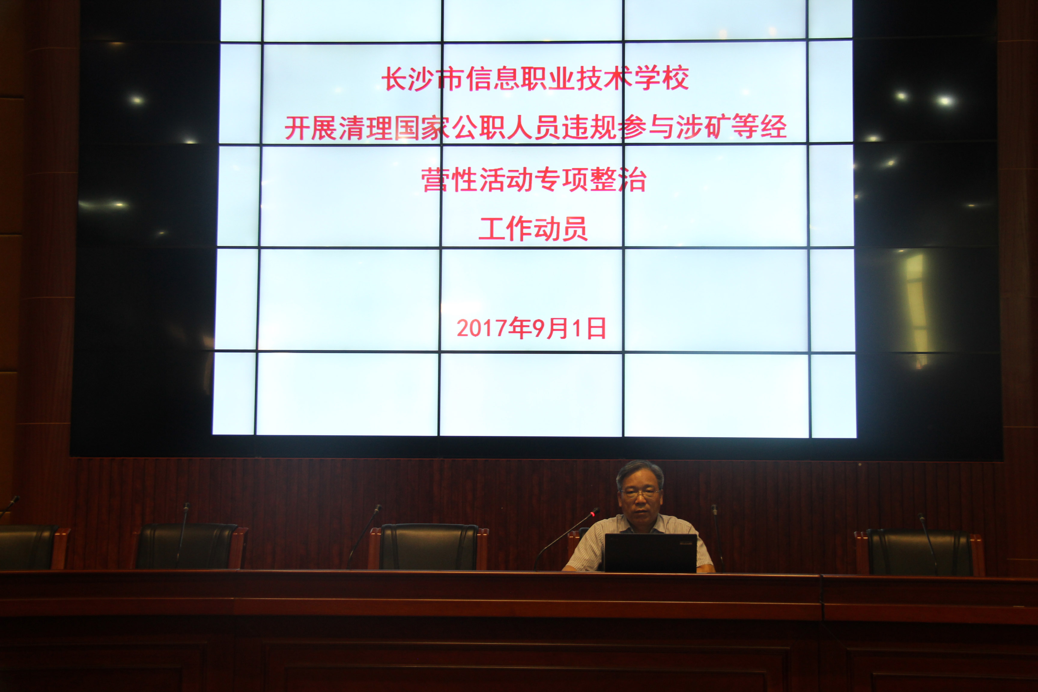 党委书记张国斌传达了市教育局专项整治工作会议精神和《长沙市教育局开展清理国家公职人员违规参与涉矿等经营性活动专项整治工作实施方案》,对这次专项整治工作的目标、清理对象、清理内容、工作要求、工作步骤以及保障措施等进行了全面详细的说明,对我校贯彻落实专项整治工作作了具体部署。