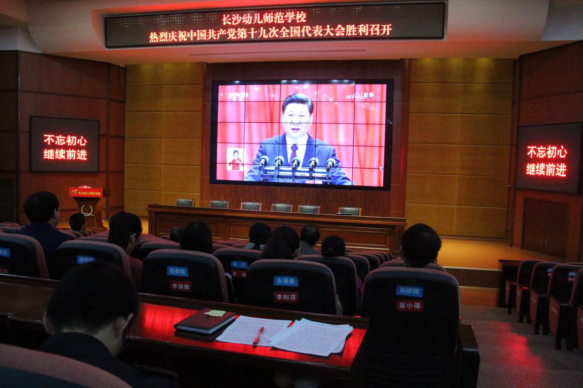 汇智厅内,“长沙幼儿师范学校热烈庆祝中国共产党第十九次全国代表大会胜利召开”的标语格外醒目,全校每个党员教师都沉浸在喜迎十九大胜利召开的浓厚氛围里。整整3个多小时的开幕会直播,大家聚精会神听报告、全神贯注作笔记,仿佛置身于大会现场聆听报告,时而激动,时而自豪,时而骄傲,表现出了对党的无限热爱和对党的十九大的热切祝贺。