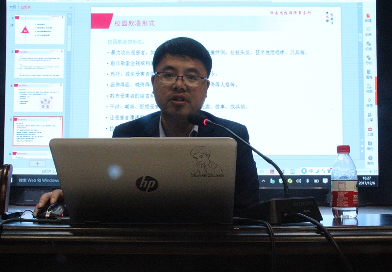 12月6日,学校邀请北京盈科(长沙)律师事务所专职律师王振林围绕“校园欺凌——与不良人员结交的恶果”主题为全校学生作专题讲座。讲座结合案例剖析了“校园欺凌”的起因、危害和后果,并从学校、家长以及学生自身三个角度详细讲解了预防和阻止校园欺凌的主要措施。通过讲座帮助学生们了解了如何正确有效的预防校园欺凌,懂得了怎样进行自我防范,明白了规范言行,洁身自好的重要性。