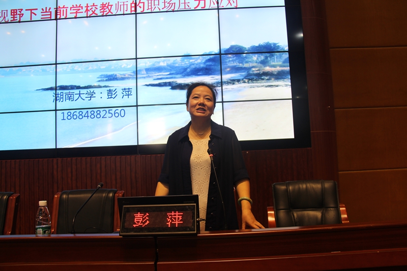 下午,彭萍作了《生涯视野下当前学校教师的职场压力应对》的专题讲座,副校长周文华主持讲座。彭萍结合自身丰富的心理专业教师工作经验,从职业生涯的视角,阐述了教师应当如何有效应对工作压力,并运用案例指出了教师如何有效疏导学生心理问题的建议,为老师们开展自我心理调适与教育教学管理工作提供了精神食粮。
