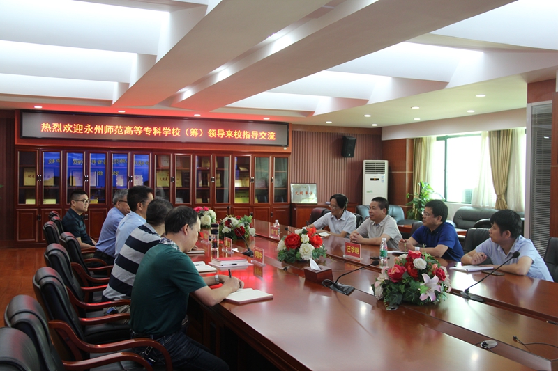 2019年9月27日上午,永州师范高等专科学校(筹)何云峰校长一行五人来校进行交流访问。上午10时,学校校长郭正良、党委书记张国斌、副书记兼纪委书记李慧中、副校长周文华和党政办公室主任何曙光等在道馨楼广益厅会议室接待了何云峰校长一行,并与他们交流座谈。
