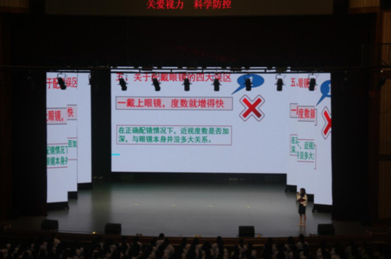 眼睛心灵的窗户,是人生中的重要伴侣。首先,戴老师通过大数据让学生了解我国中学生近视情况的严重程度,强调关爱视力、预防近视的重要性,并且详细分析了近视产生的三大因素分别是遗传、环境、营养饮食因素。紧接着戴老师通过直观地视觉体验带大家走出日常生活中用眼护眼存在的误区,同时也分享了许多的科学防护知识。如阅读时光线要舒适,连续用眼时间不宜过长,养成正确的阅读习惯等。戴老师通过例举身边的案例让学生更真实的体会近视给我们生活带来的不便,以此呼吁学生合理用眼,科学防护。
