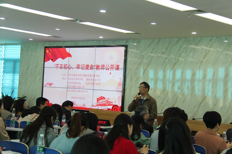 为进一步激发全市教育系统“不忘初心、牢记使命”的政治自觉和行动自觉,树立先进典型,大力宣传不同时期优秀教育工作者的教育初心与使命,10月29日上午,市教育局主题教育第六指导组教师公开课在长沙幼儿师范学校开讲,指导组副组长胡党生及成员李艳、张慧霞,地质中学党委书记蔡席春,幼儿师范党委书记张国斌,雷锋学校纪委书记施远亭,雅礼洋湖党总支书记张锡,长沙六中党委书记崔泽文,雅礼实验党委办主任汤慧和各学校教师代表参加。