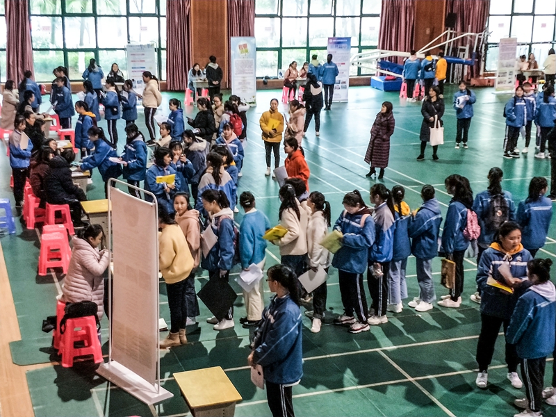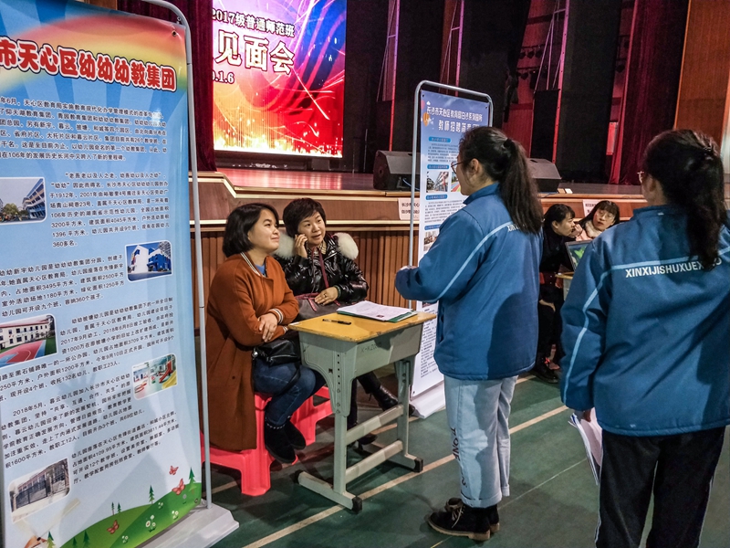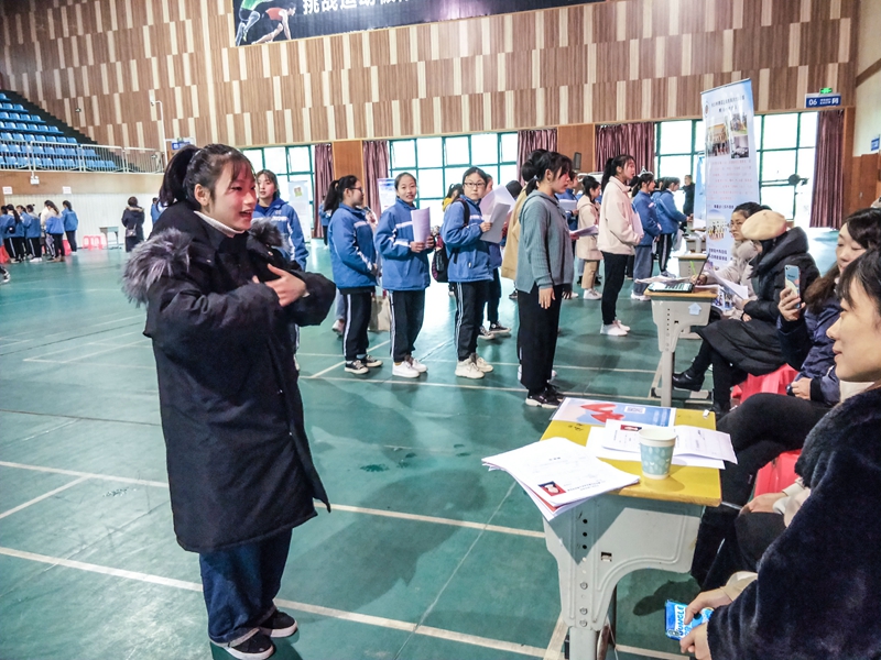 “你刚刚的教学能力展示非常精彩,我们正需要你这样的老师,欢迎你加入我们园!”,湖南省委机关新湘幼儿园的余老师开心的接过学前教育系1710班邓洁同学的推荐表。这是2020年1月6日长沙幼儿师范学校2017级普通师范班实习生见面会上的一幕。实习生们在面试现场通过讲故事、舞蹈、唱歌、朗诵、绘画等形式展示了他们的业务能力。32家省市知名幼儿园在学校汇美馆围场而坐,争相招募实习生。