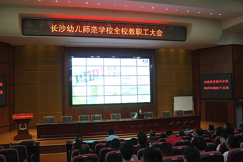为进一步普及垃圾分类知识,强化垃圾分类意识,营造人人知晓、人人参与的良好氛围,6月22日下午,我校召开教职工大会,邀请湖南现代收易环保技术有限公司讲师凌弘佳进行垃圾分类专题培训。培训会由我校校长郭正良主持,全校教职工参加培训。