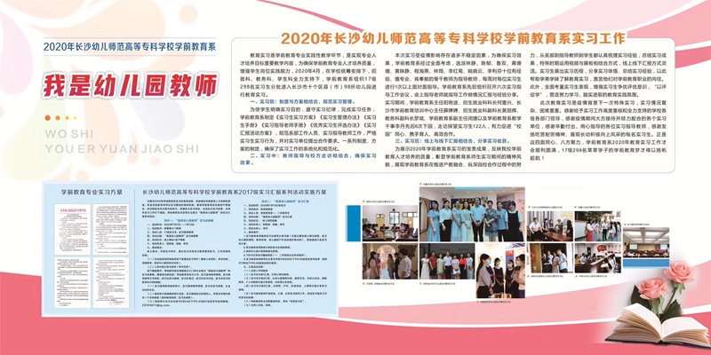 根据《长沙幼儿师范学校学前教育系2017级实习汇报活动实施方案》,活动采取视频与展板展示,线上与线下汇报的方式,灵活而全面地展现我系师生实习中的点点滴滴:一是在校园官网学前教育系板块开辟“我是幼儿园教师”实习成果专栏,展示实习教师及实习生成果;二是,通过实习生自荐、实习指导老师推荐、幼儿园评荐以及系部综合考评,从实习工作简介、实习指导老师掠影及感悟、实习生作品、实习生日记、实习生掠影及感悟等方面将31篇优秀感悟、31个实习生作品以及100多张实习精彩瞬间照片悉数展出;三是线上汇报,优秀实习生代表朱倩、卢情、周紫怡线上分享实习体悟、总结实习经验,以此帮助学弟学妹了解教育实习,激发他们对学前教育职业的向往,实习指导老师代表林筠从实习指导园所情况简介、实习生管理模式以及实习单位对我校实习生的高度评价三方面分享了实习指导工作感悟,阳艳波主任从实习工作开展情况总结以及对高一高二学生的希望与建议方面展开了分享,阳艳波主任表示:此次教育实习是疫情背景下一次特殊实习,实习情况复杂,所以特别感谢给予实习工作高度重视和全力支持的学校各级各部门领导,感谢疫情期间大方接待并倾力配合的各个实习单位,感谢辛勤付出、用心指导的各位实习指导教师,感谢发扬吃苦耐劳精神、展现长幼积极向上风采的每名实习生,正是大家的同心聚力,学前教育系2020年教育实习工作才会顺利圆满。