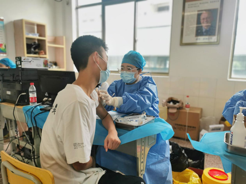 上午12:00,374名学生顺利完成第一针疫苗接种,信息技术系罗泽宇同学接种完后感叹,“接种流程很快,在这样特殊的时期,学校组织集中接种,免去了我们在校外预约、排队的繁琐,让人心安”。